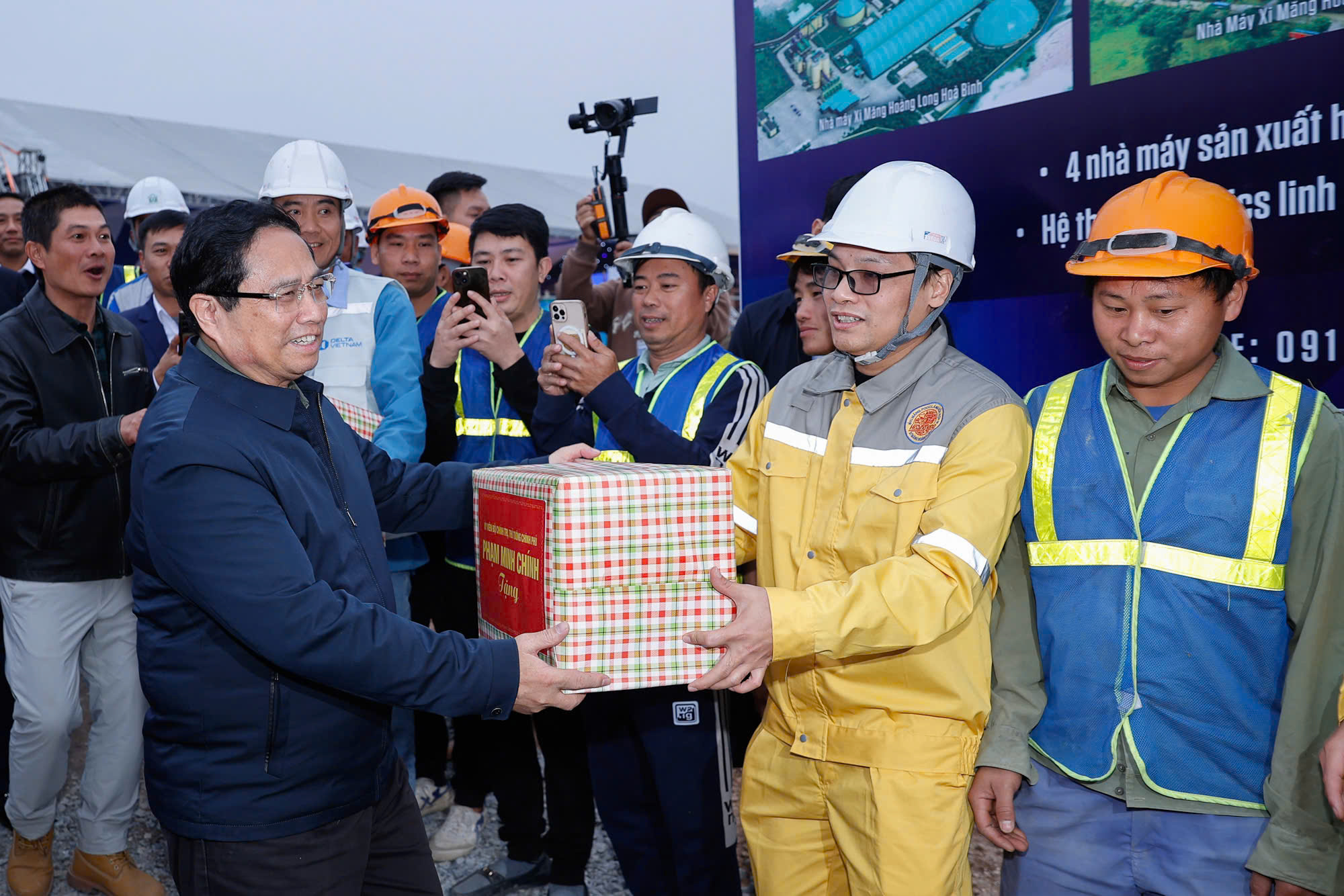 Thủ tướng Chính phủ trao quà tặng cho người lao động của Xi Măng Hoàng Long tại lễ khởi công dự án nhà ở xã hội Golden Square Lào Cai.